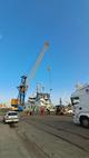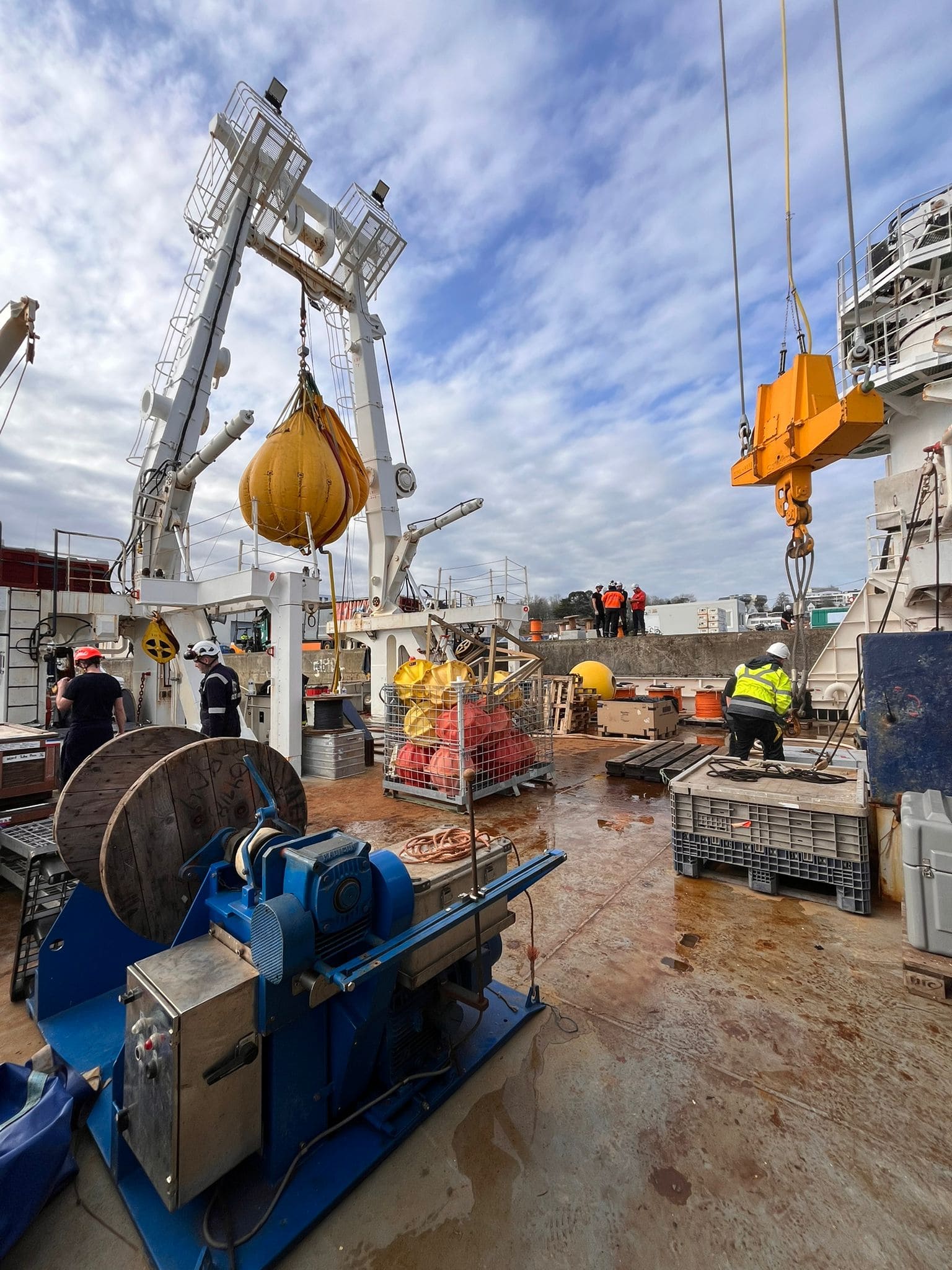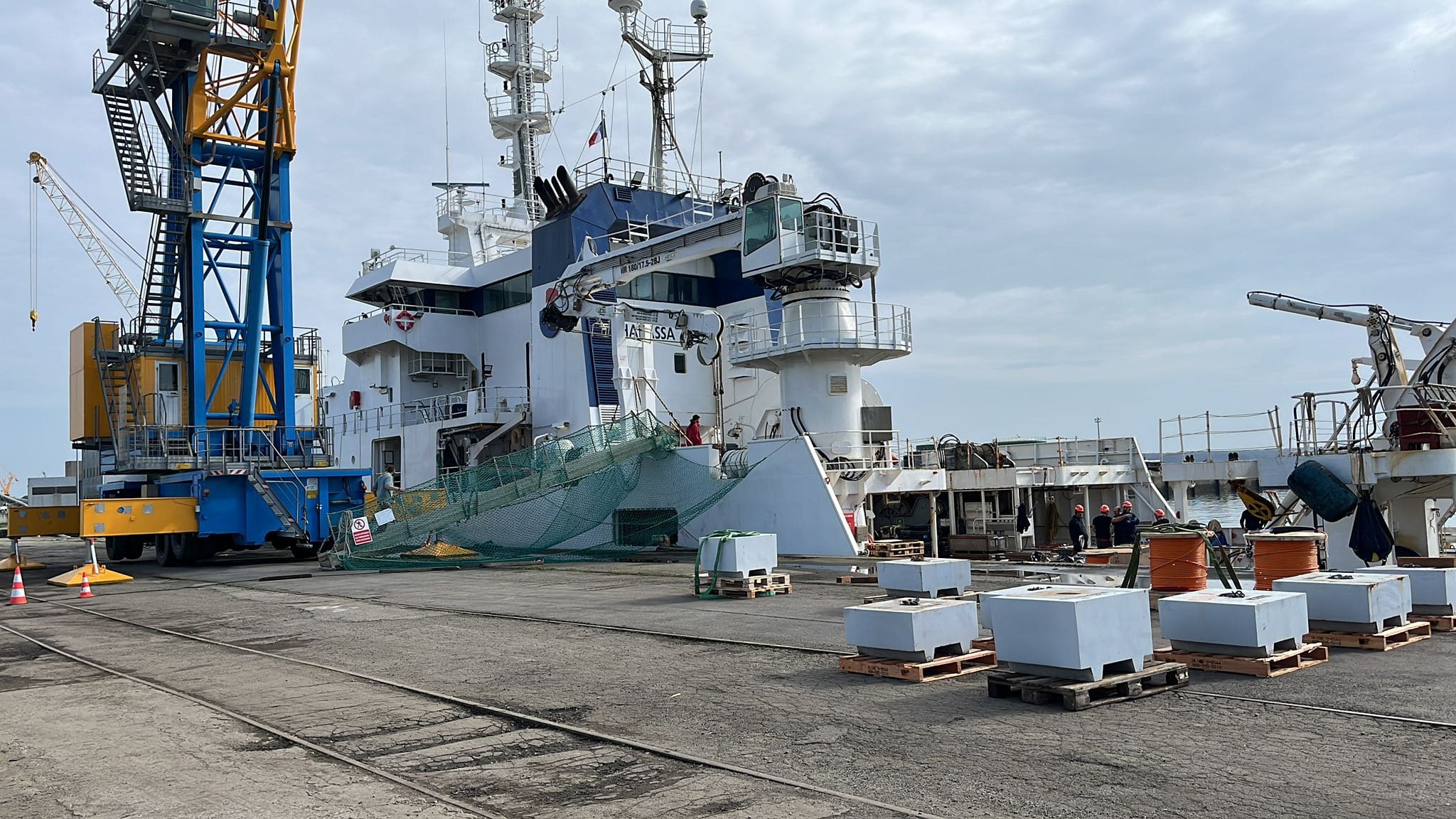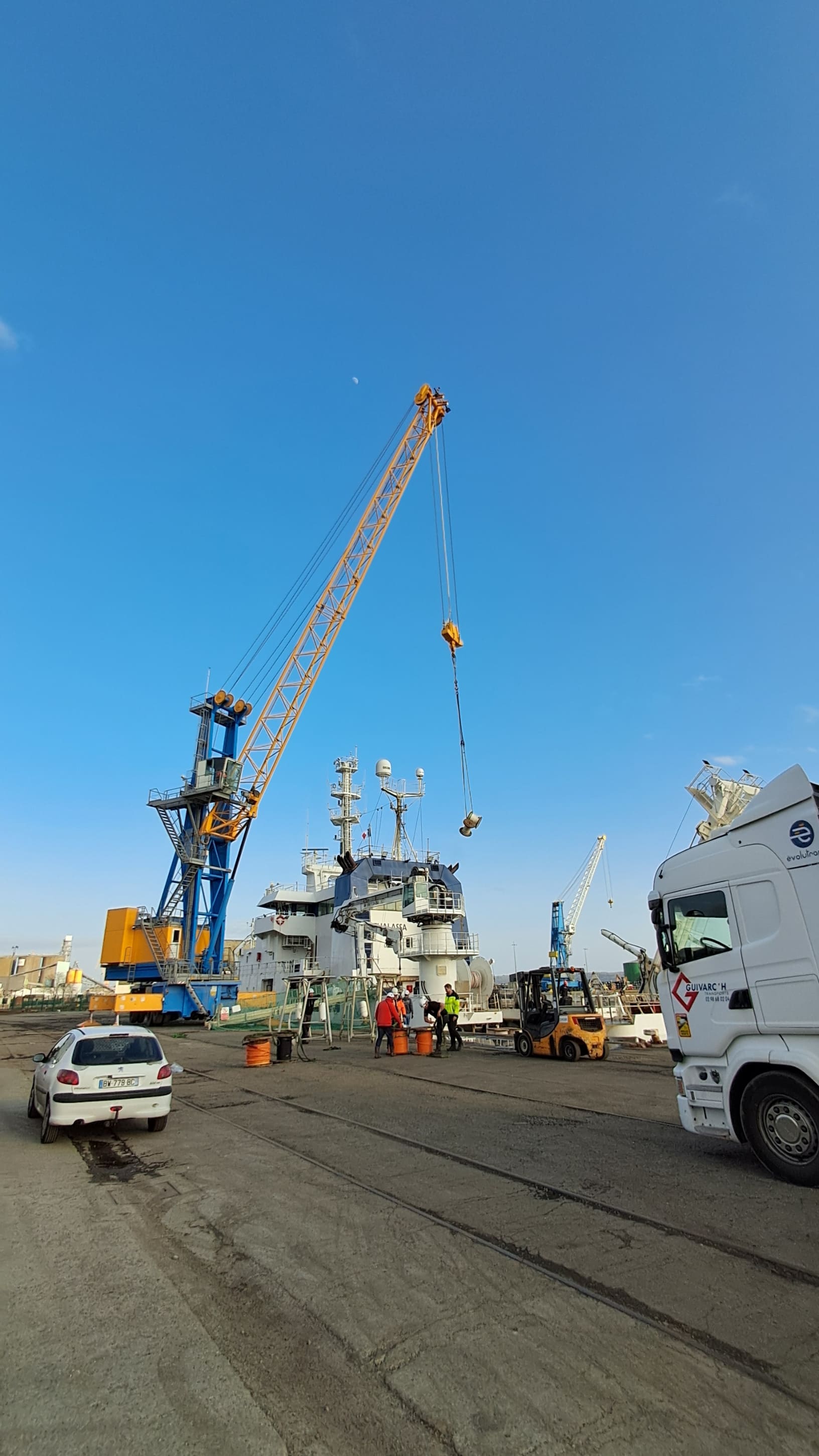 Une fois au port de commerce de Brest, les camions ont été déchargé sur le quai par des Dockers, puis le matériel a été mis à bord du N/O Thalassa de la Flotte Océanographique Française grâce aux dockers et aux marins de GENAVIR.