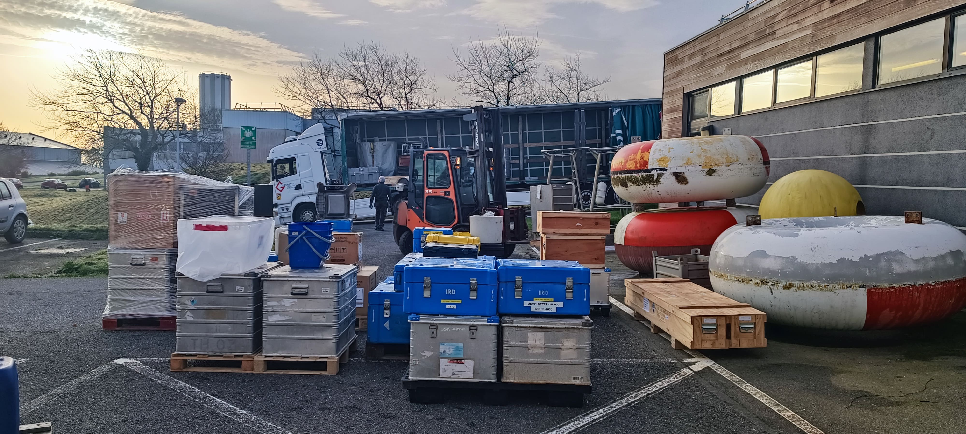La majeure partie des équipements scientifiques a été chargé à bord de 3 camions au centre Ifremer par l'équipe de l'UAR IMAGO BREST avec l'aide de collègues du Laboratoire LEMAR de l'IRD.